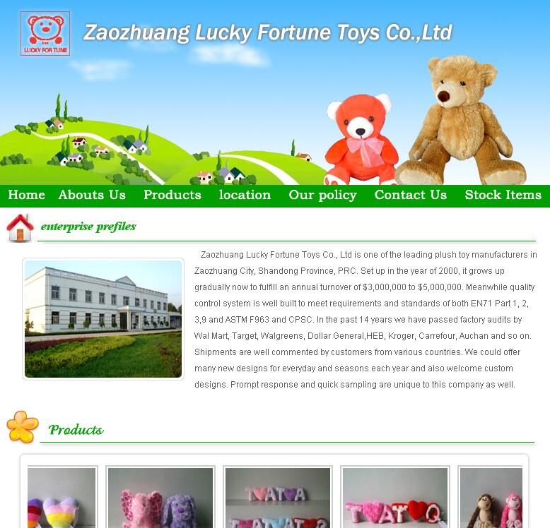 Zaozhuang Lucky Fortune Toys Co., Ltd is one of the leading plush toy manufacturers in Zaozhuang City, Shandong Province, PRC. Set up in the year of 2000, it grows up gradually now to fulfill an annual turnover of $3,000,000 to $5,000,000. Meanwhile quality control system is well built to meet requirements and standards of both EN71 Part 1, 2, 3,9 and ASTM F963 and CPSC. In the past 14 years we have passed factory audits by Wal Mart, Target, Walgreens, Dollar General,HEB, Kroger, Carrefour, Auchan and so on. Shipments are well commented by customers from various countries. We could offer many new designs for everyday and seasons each year and also welcome custom designs. Prompt response and quick sampling are unique to this company as well.