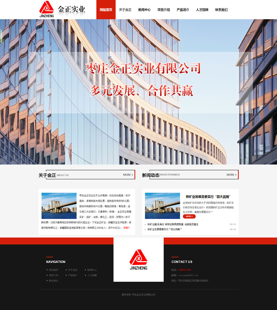 祝賀金正實(shí)業(yè)有限公司網(wǎng)站上線 公司介紹: 棗莊金正實(shí)業(yè)位于山東南部。處在京臺(tái)高速、京滬高鐵、津浦鐵路中間位置,距鐵路專用貨場(chǎng)5公里,距徐州觀音機(jī)場(chǎng)70公里,毗臨日照港、青島港、連云港三大出?,交通便利、快捷。 金正實(shí)業(yè)是集采礦、選礦、冶煉、煤化工、投資、貿(mào)易為一體不斷發(fā)展,已成為魯南地區(qū)較有影響力的大型企業(yè)。下設(shè)金正礦業(yè)、新疆雙全五洋能源、并參股伊犁特煤化工、新疆國投寶地能源等公司,F(xiàn)有職工3000余人,資產(chǎn)20億元。先后獲得棗莊百強(qiáng)企業(yè)、突出貢獻(xiàn)企業(yè)、誠信經(jīng)營企業(yè)、納稅十強(qiáng)企業(yè)、山東省工會(huì)工作先進(jìn)企業(yè)等榮譽(yù)稱號(hào)。 金正礦業(yè)年產(chǎn)鐵精粉60萬噸,金正實(shí)業(yè)年產(chǎn)鑄造用生鐵26萬噸,主要銷往江蘇、浙江、福建、安徽、河北、山東等地,深受廣大客戶好評(píng)。 公司始終秉承“多元發(fā)展、合作共贏”的經(jīng)營理念,遵循“精誠團(tuán)結(jié)、銳意進(jìn)取”的企業(yè)精神。竭誠為客戶提供優(yōu)質(zhì)的產(chǎn)品和服務(wù)。真誠歡迎各界同仁前來指導(dǎo)、合作,我們?cè)概c您風(fēng)雨同舟、攜手共創(chuàng)美好未來。 棗莊金正實(shí)業(yè)有限公司