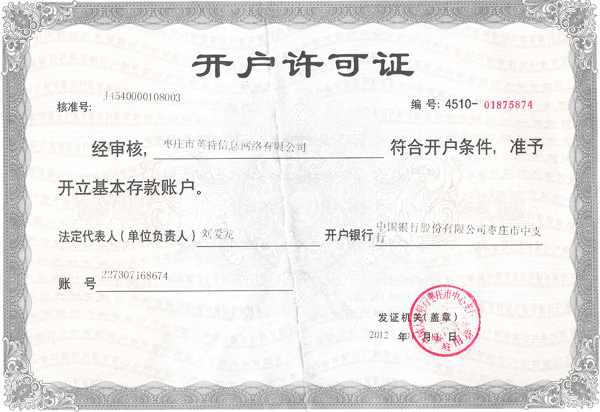 棗莊市英特信息網(wǎng)絡(luò)有限公司已經(jīng)三證合一了,下面是公司的新營業(yè)執(zhí)照的副本。棗莊市英特信息網(wǎng)絡(luò)有限公司營業(yè)執(zhí)照(統(tǒng)一社會信用代碼:91370402863129563Y)